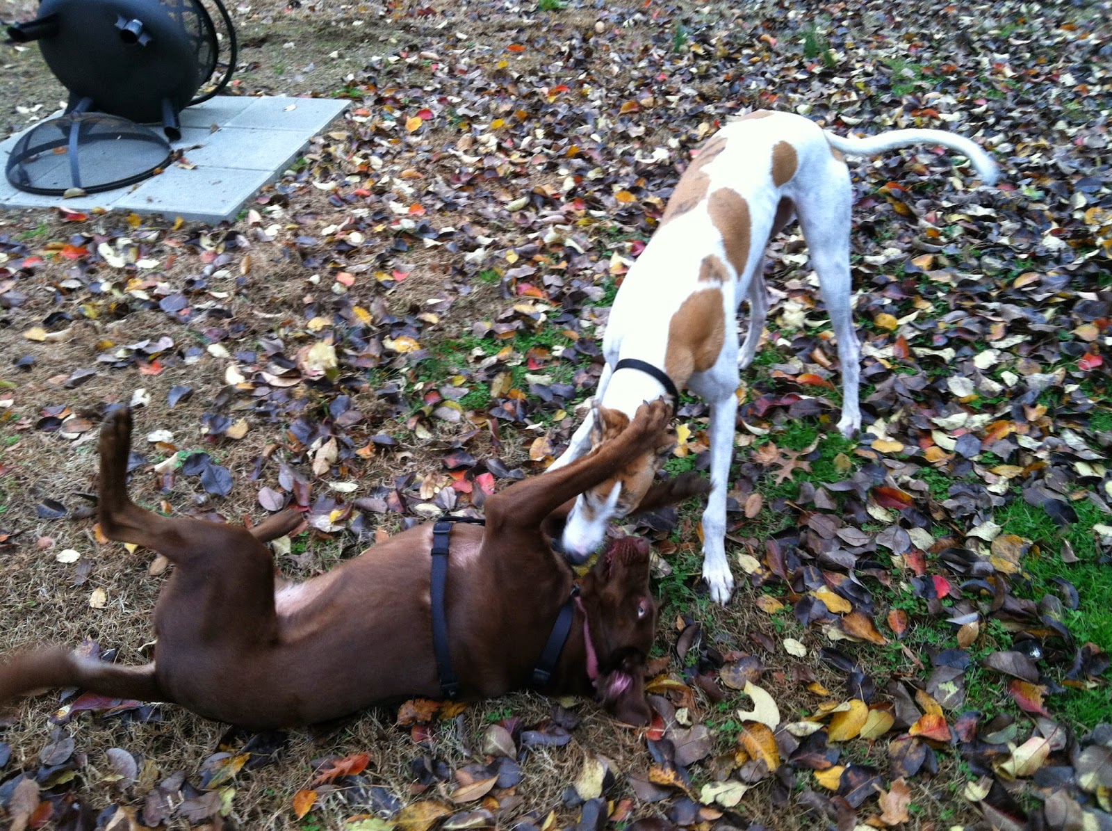 As time has gone on, Kiowa has sort of figured out how to control Bella’s incessant energy.  When, after their run fest, he can’t take it any longer, he opens his mouth and puts it around her neck gently.  She falls on the  ground, and he holds her there with his mouth.  OMG!  She can’t get enough of it.  I can almost hear her saying, “Oh, big boy, I love it”.  The minute he lets her go, she jumps up and resumes her antics.  He may put her down several times, but up she jumps.  That’s Bella.
