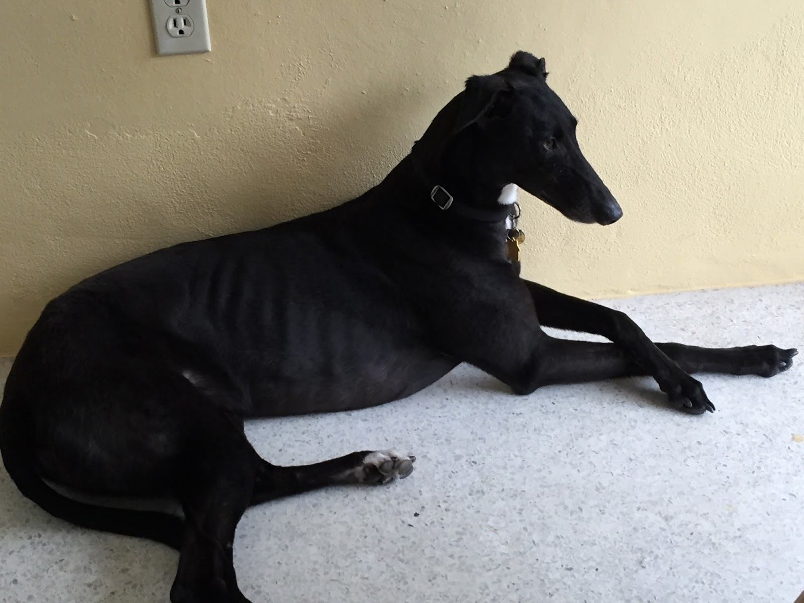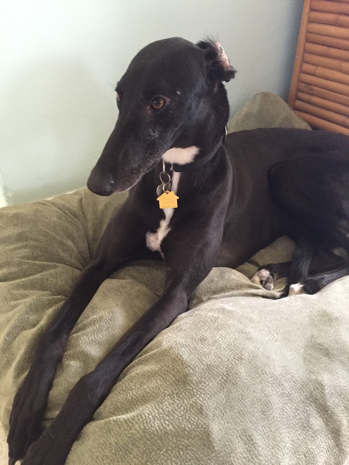 Three of our eight greys have been black. In my experience, each dog, no matter what the color, has its own unique personality. The lighter colored dogs may be more striking at first, but, if you really look at these black beauties, their exquisite features and delicacy will win your heart.