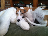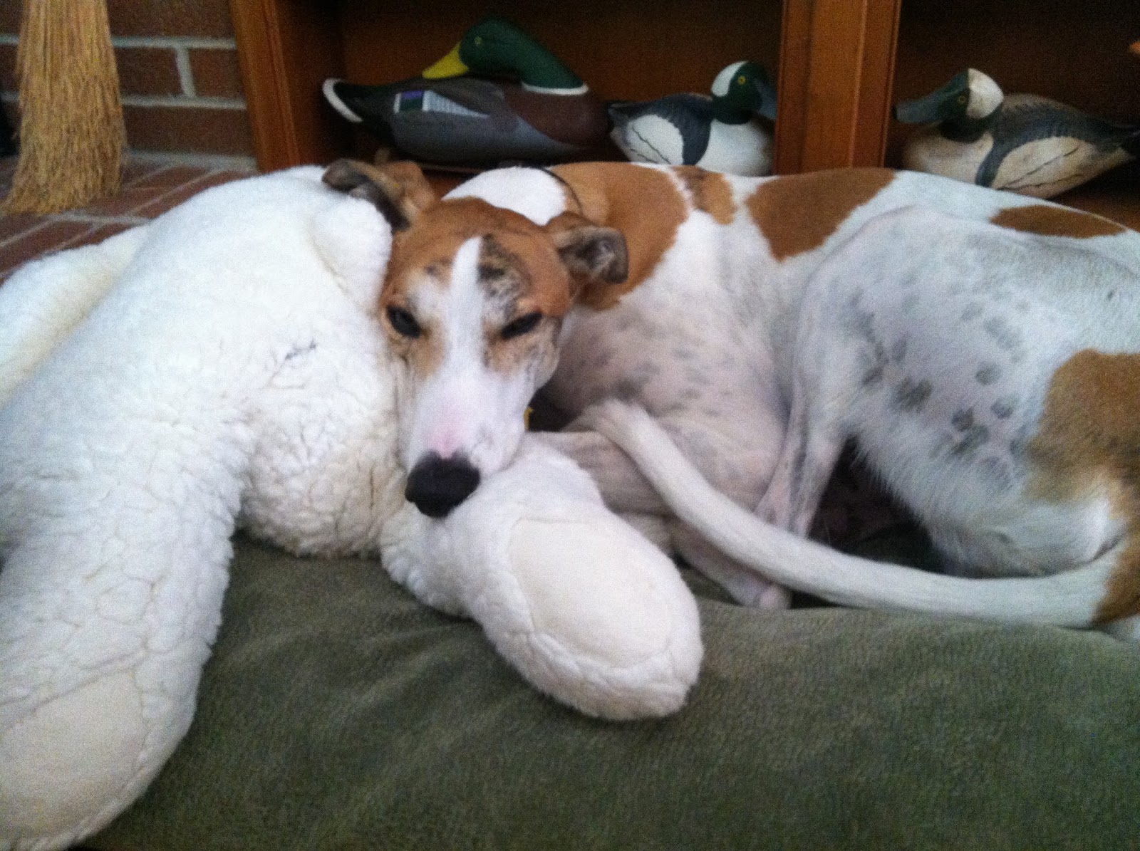 When Emma came along, we were unsure if she might be an alien in a greyhound body. She did not display traits we were used to in our greys. She was young, just turned 2. She had and still has oodles of puppy in her and plays nonstop. She loves every toy and thus has interested Kiowa in them. She chases balls (unheard of for any of our other dogs) and is just an exuberant girl. She likes to talk and enjoys being talked to. She constantly follows me. Sometimes I will stop walking unexpectedly, and she will bump right into me. Having these two is like enjoying a comedy routine daily.