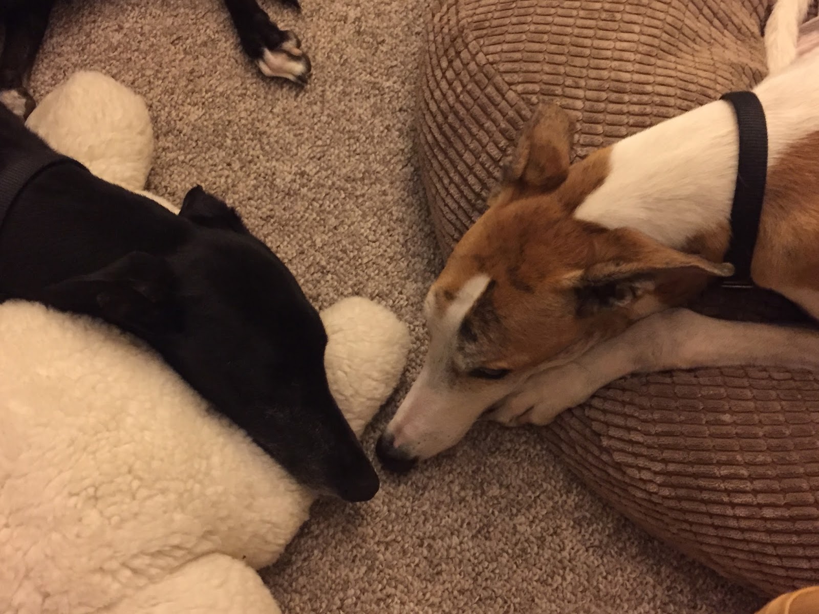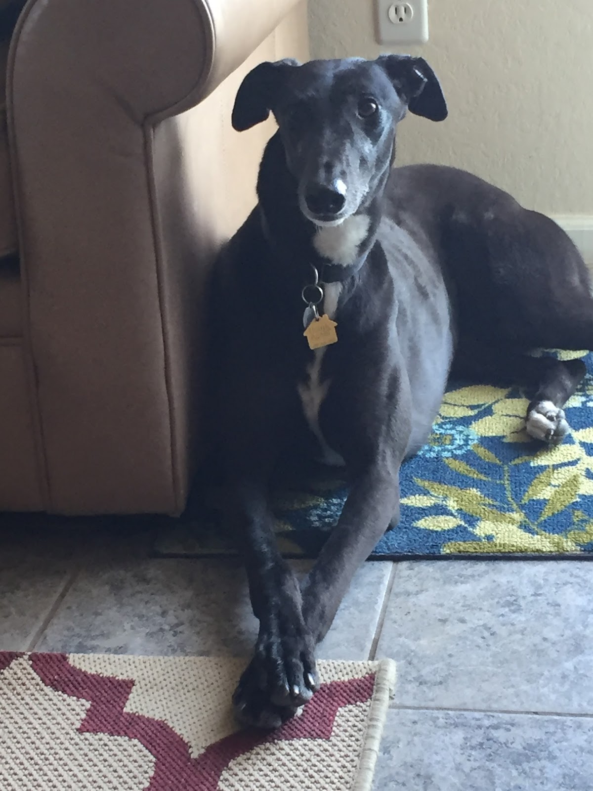 For a Writers’ Group prompt, we were to introduce our muse, our source of inspiration. As I pondered my muse, it occurred to me that it lay directly in front of me on the floor, two sets of legs stretched upward in a cockroach position. My greyhounds touch my heart everyday with their large brown eyes or one of their silly postures.